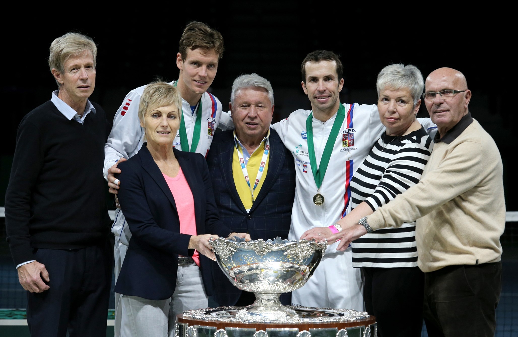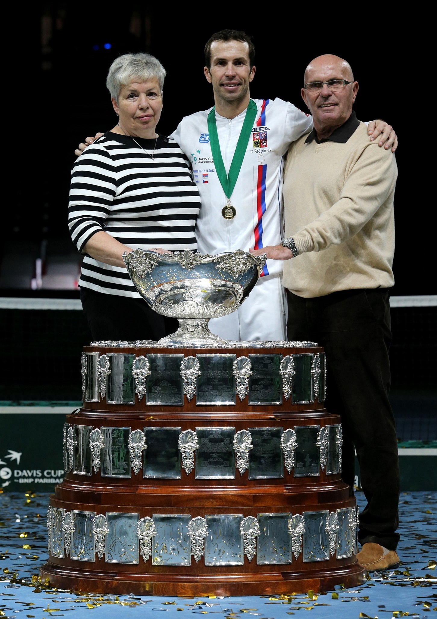 Čeští tenisté Tomáš Berdych a Radek Štěpánek s rodiči a manažerem Miroslav Černošek (uprostřed) u trofeje pro vítěze Davis Cupu