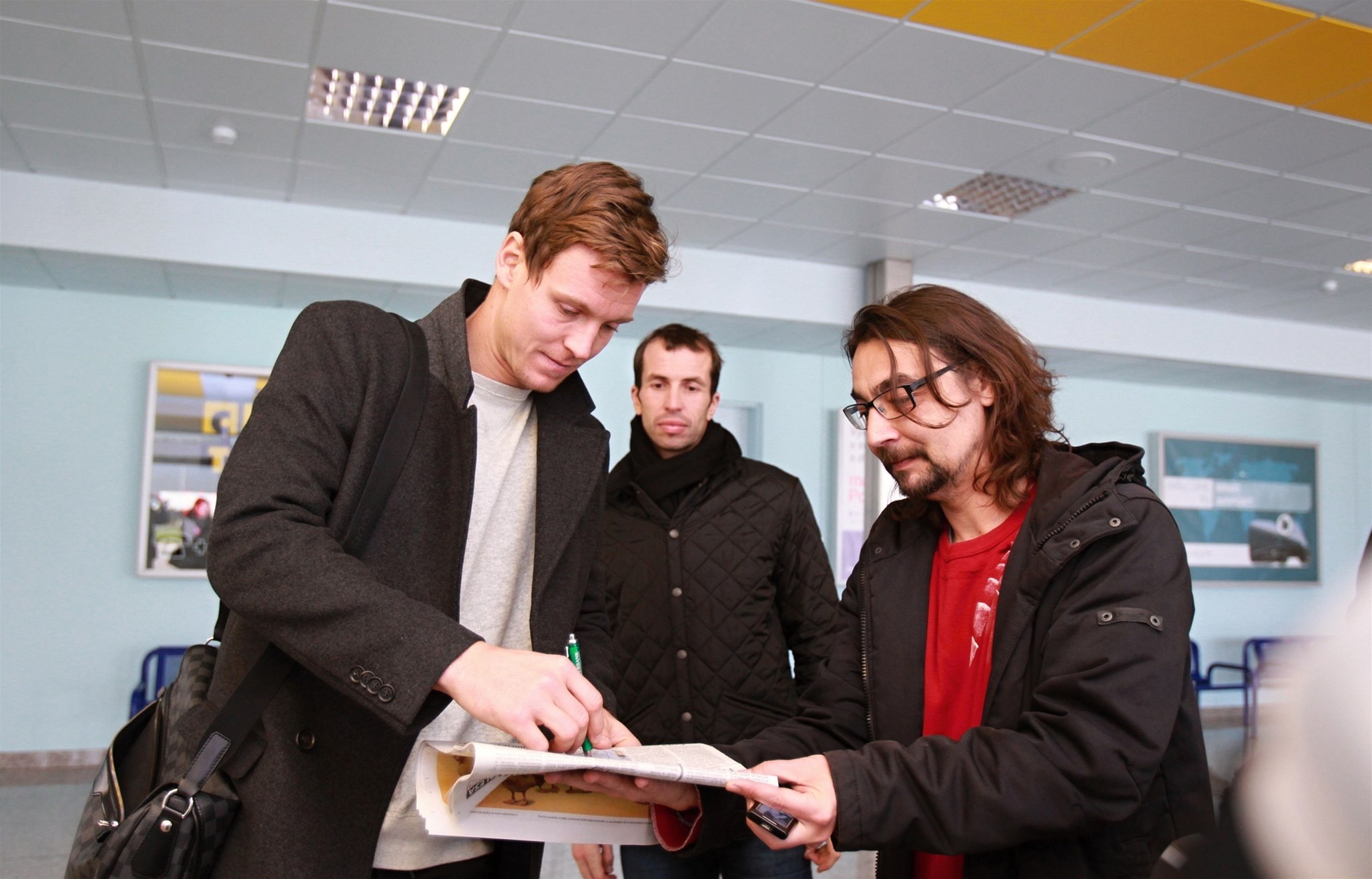 Tenisté se vrátili z finále Davis Dupu. Tomáš Berdych dává autogram jendomu z fanoušků na letišti, v pozadí je Radek Štěpánek