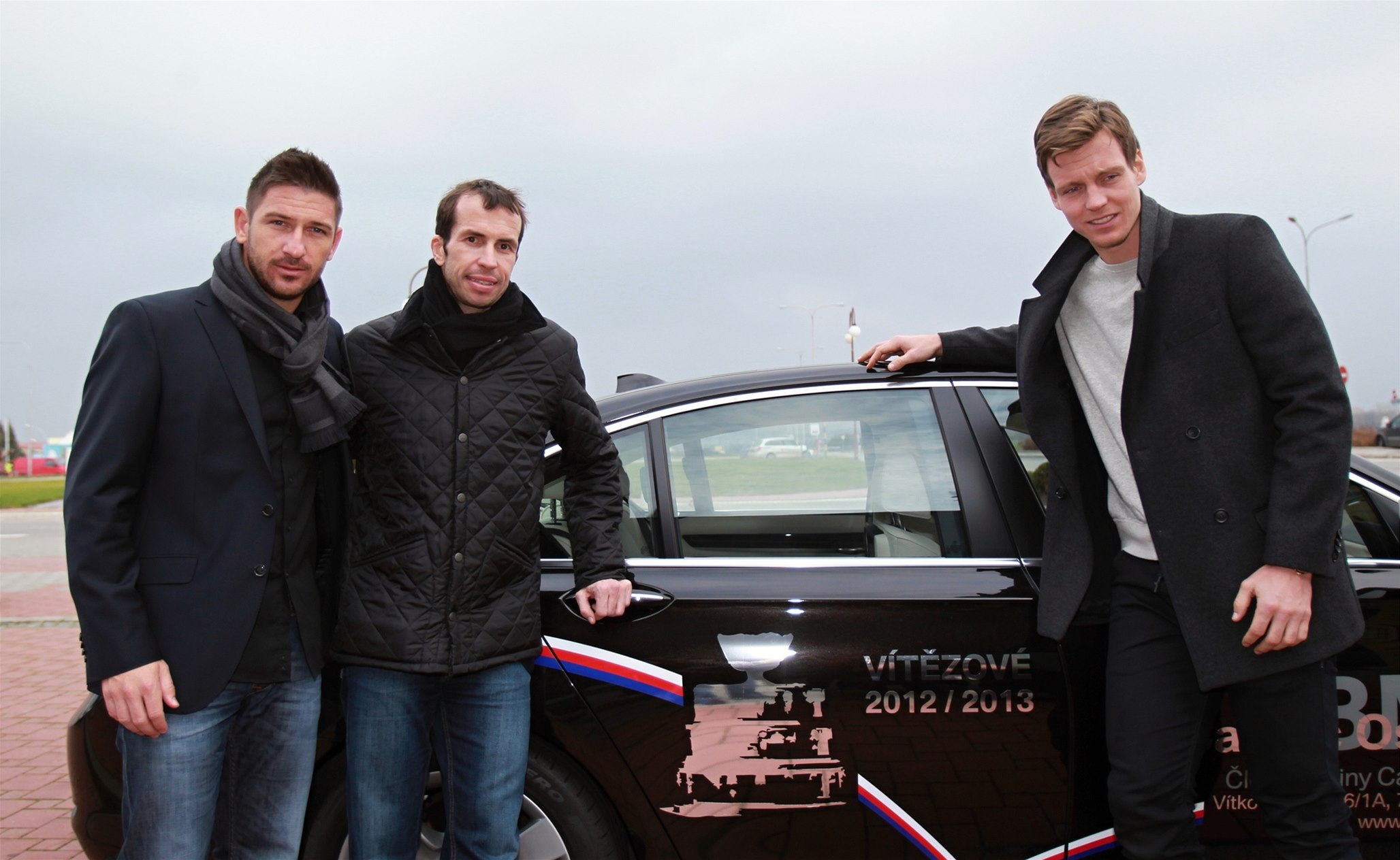 Tenisté se vrátili z finále Davis Dupu. U auta pro vítěze pózují zleva Jan Hájek, Radek Štěpánek a Tomáš Berdych