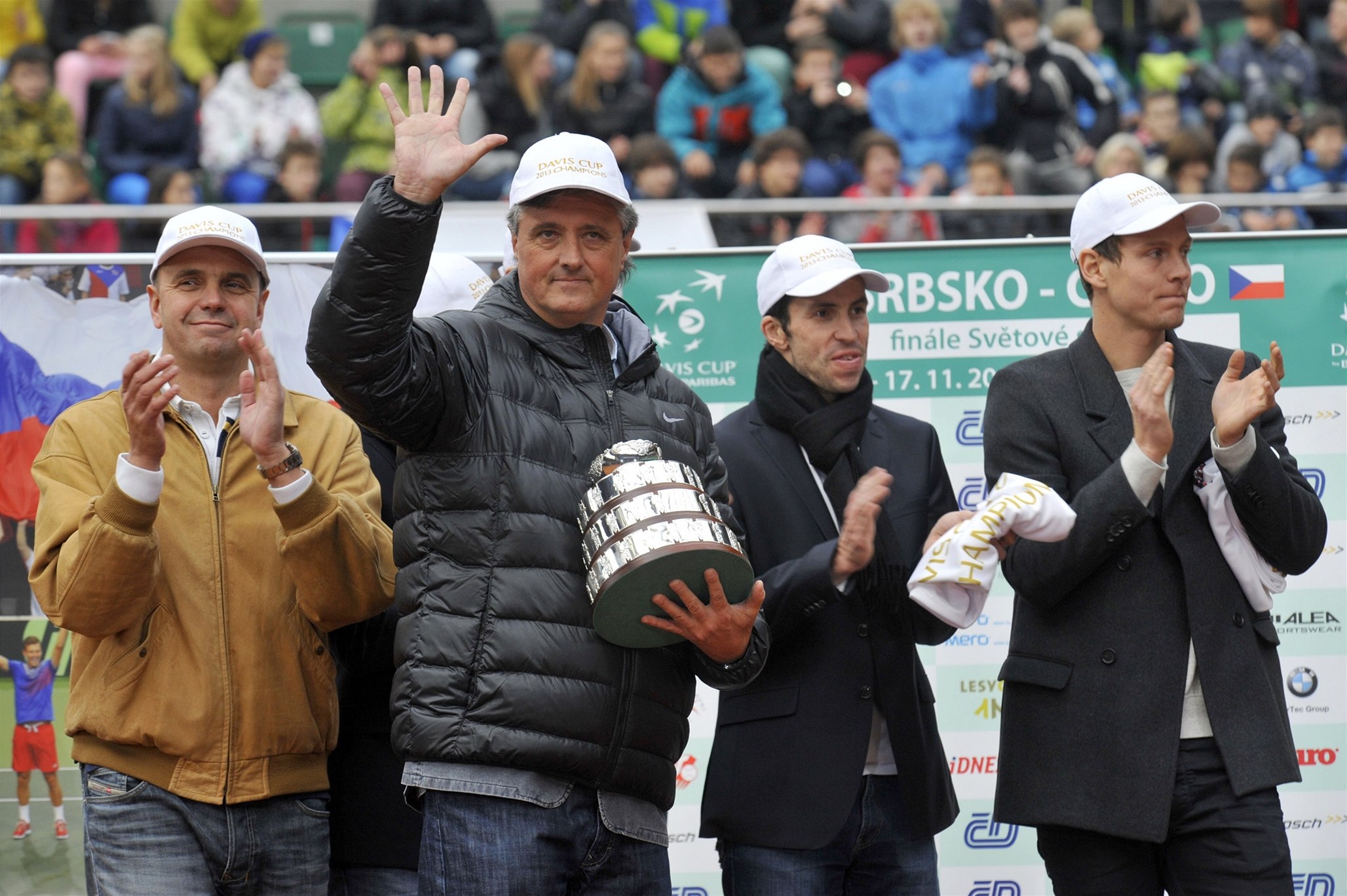 Čeští tenisté vyhráli Davis Cup. Zleva jsou Jan Hájek, Radek Štěpánek, kapitán Vladimír Šafařík, Lukáš Rosol a Tomáš Berdych