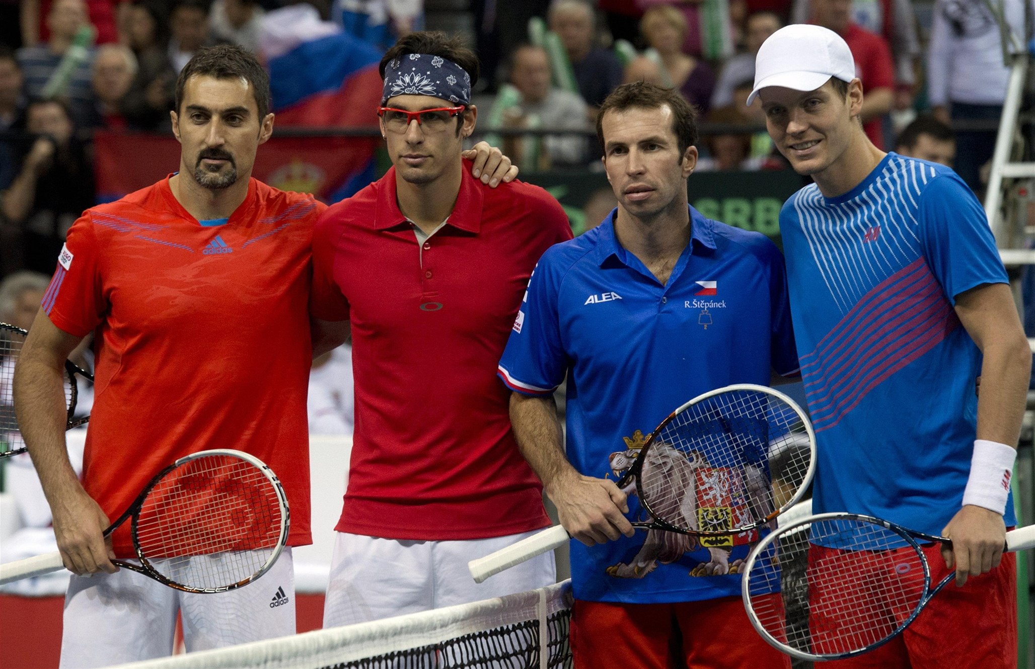 Čeští reprezentanti Tomáš Berdych (vpravo) a Radek Štěpánek v utkání proti Srbům Nenadu Zimonjičovi (vlevo) a Iljovi Bozoljacovi.