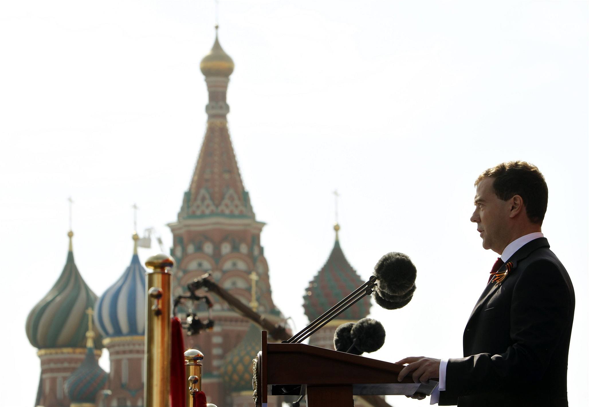 Ruský prezident Dmitrij Medveděv při projevu k výročí oslav 65. výročí vítězství ve druhé světové válce