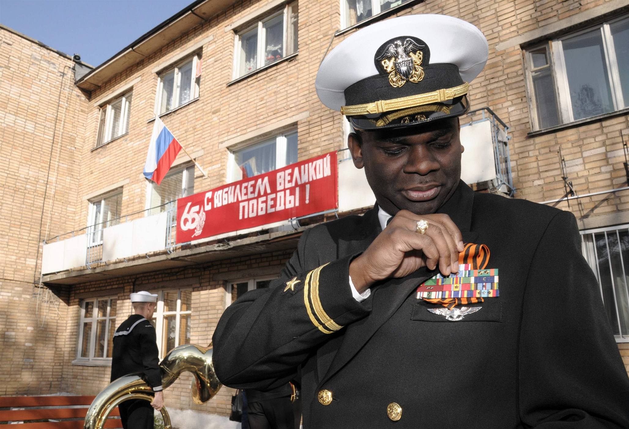 Americký námořník se stuhou sv. Jiří při oslavách 65. výročí vítězství ve druhé světové válce