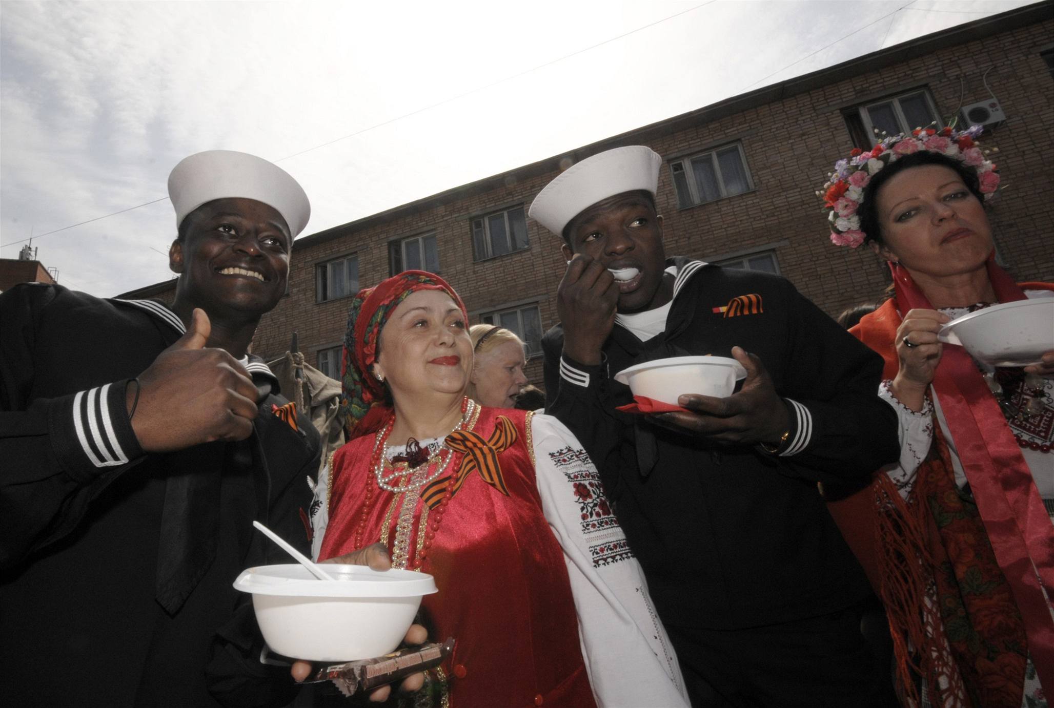Američtí námořníci s ruskými ženami v tradičních krojích při oslávách 65. výročí vítězství ve druhé světové válce