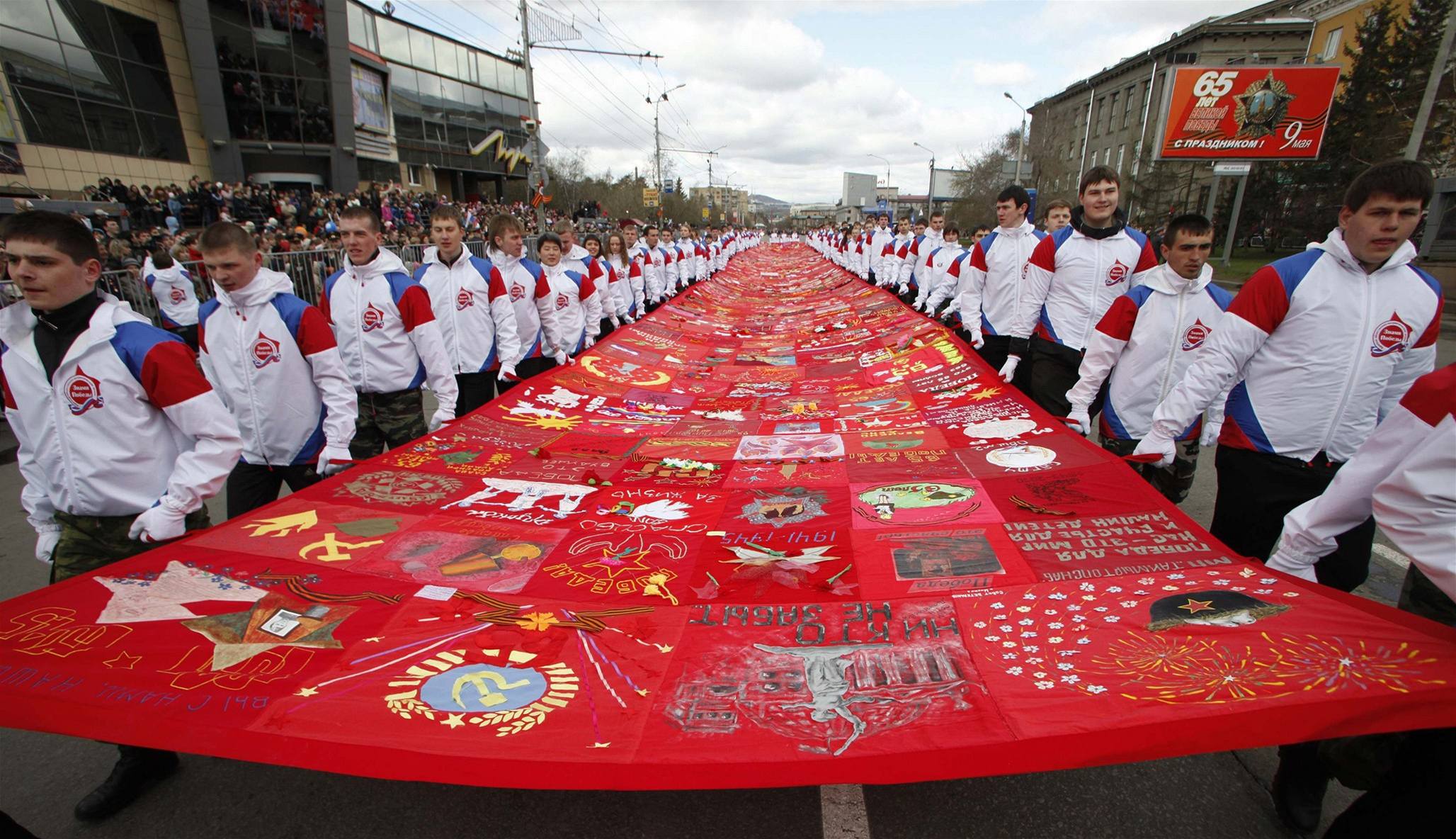 Stovka lidí nese 44 metrů dlouhý prapor s odznaky ze sibiřských měst při oslavách konce druhé světové války v Krasnojarsku
