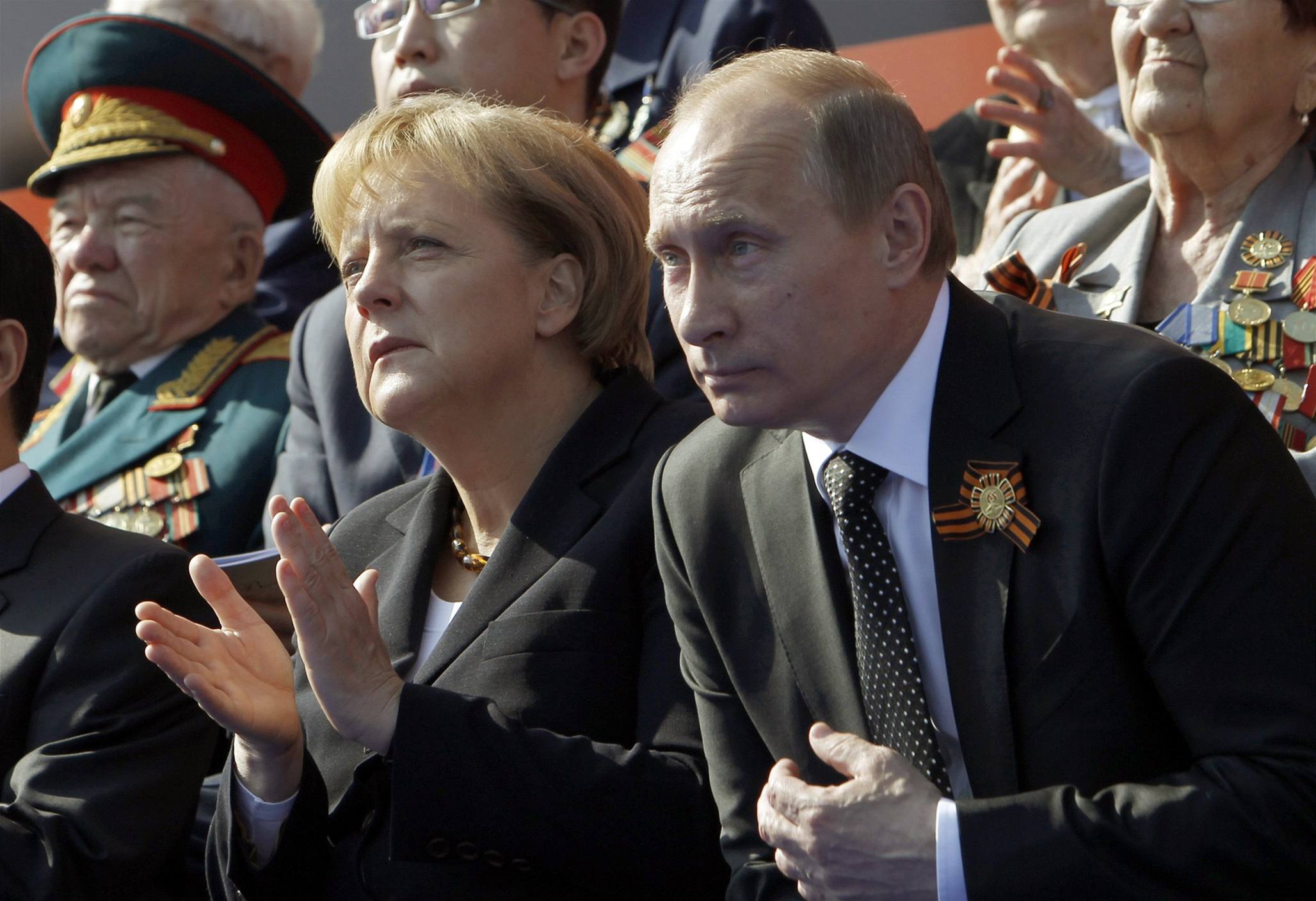 Angela Merkelová a Vladimir Putin při oslávách 65. výročí vítězství ve druhé světové válce v Moskvě