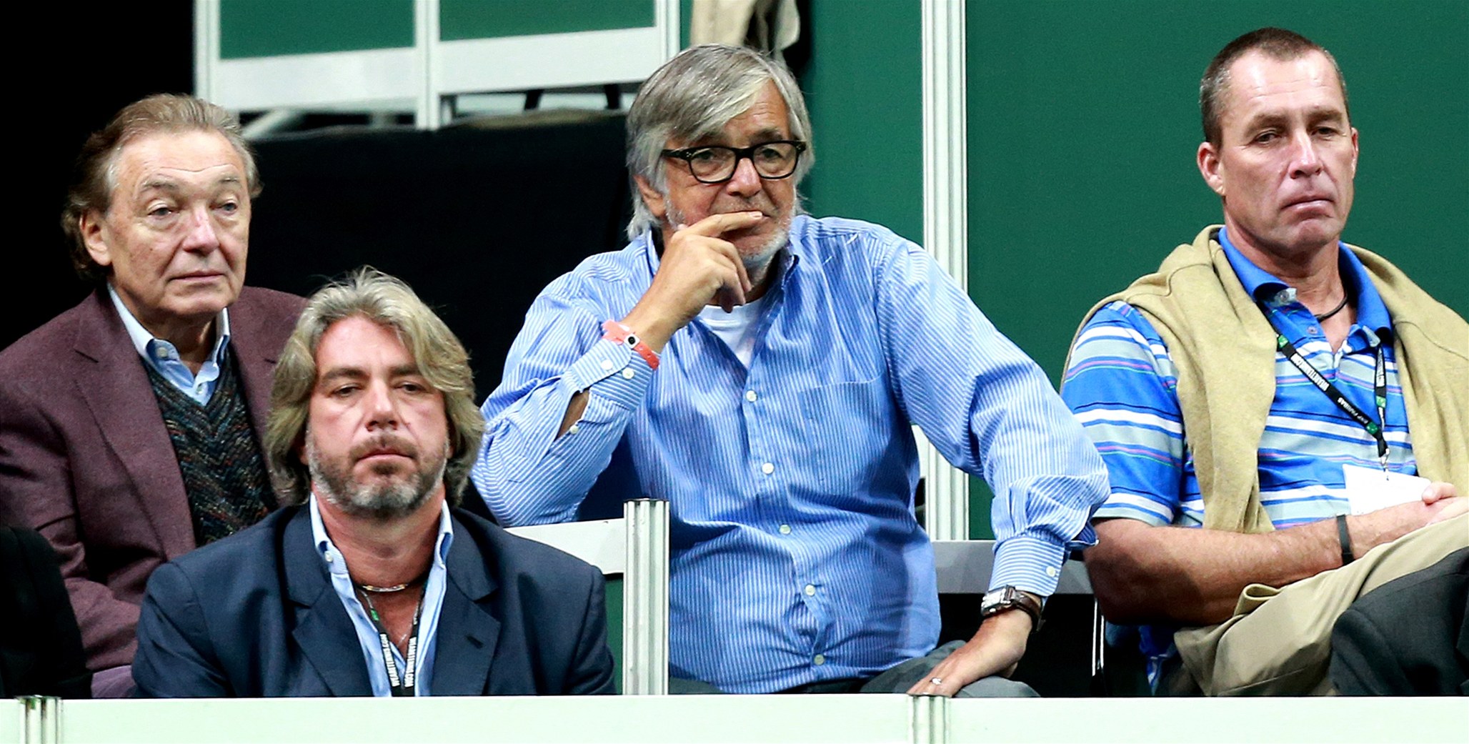 Ve VIP lóži se objevil i Karel Gott (vlevo nahoře) a Jiří Bartoška (uprostřed). Na snímku je ještě Tomáš Chrenek a Ivan Lendl (vpravo).