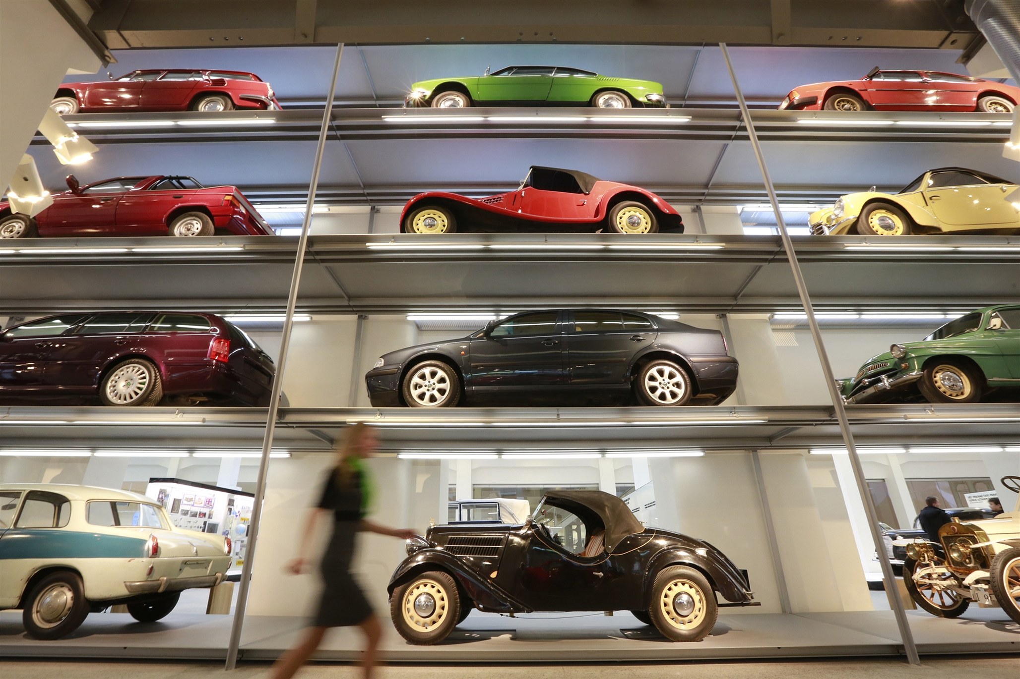 Automobily jsou řazeny nad sebou v patrech podle data výroby.