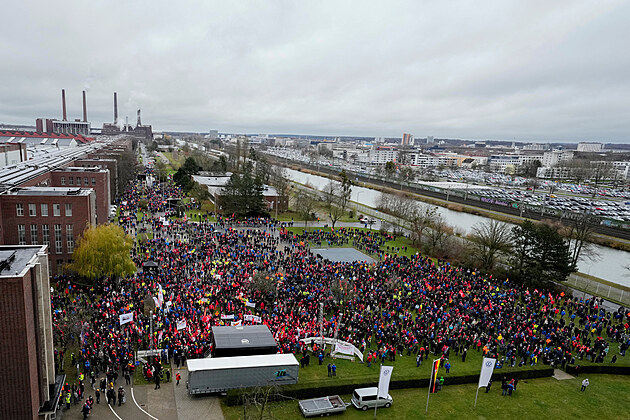 Zaměstnanci VW se účastní shromáždění odborového svazu IG Metall před sídlem Volkswagenu během výstražné stávky v továrně německé automobilky ve Wolfsburgu. (9. prosince 2024)