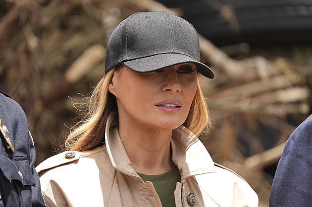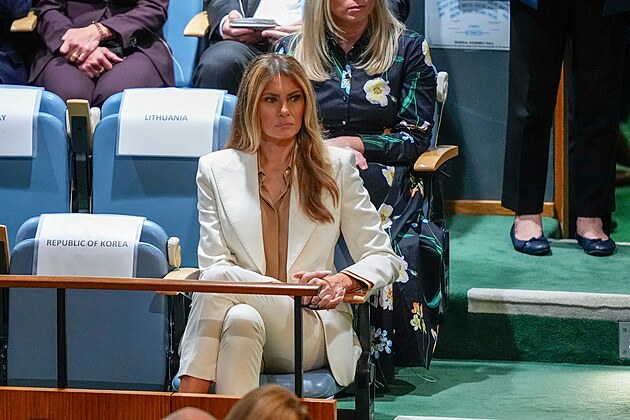 První dáma Melania Trumpová poslouchá projev prezidenta Donalda Trumpa během zasedání Valného shromáždění OSN. (23. září 2025)