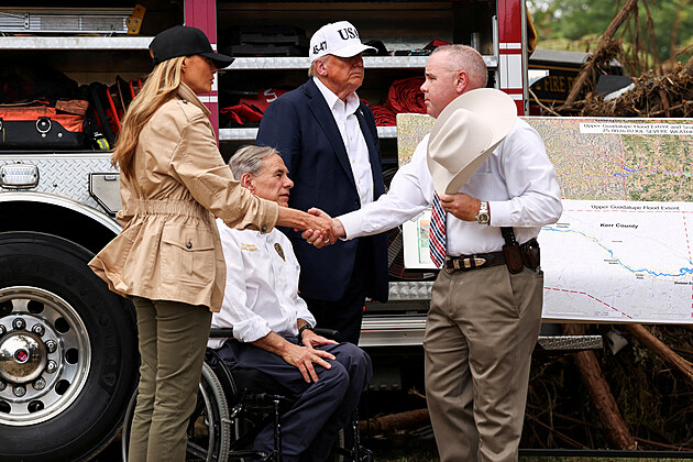 Americký prezident Donald Trump a první dáma navštívili oblast Texasu, kterou minulý víkend poničily extrémní bleskové povodně. (11. července 2025)