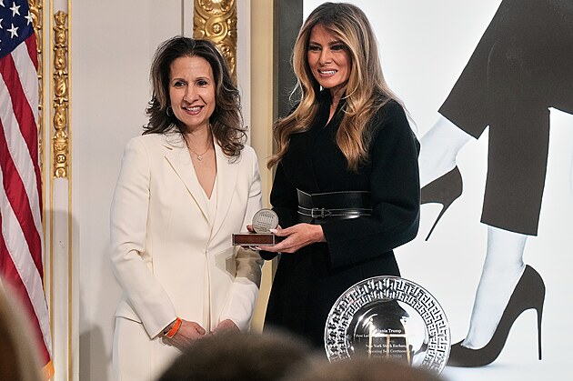 První dáma USA Melania Trumpová zahájila ve středu obchodování na newyorské burze. V pozadí reklamní plakát na film Melania, který vstupuje do kin. (28. ledna 2026)