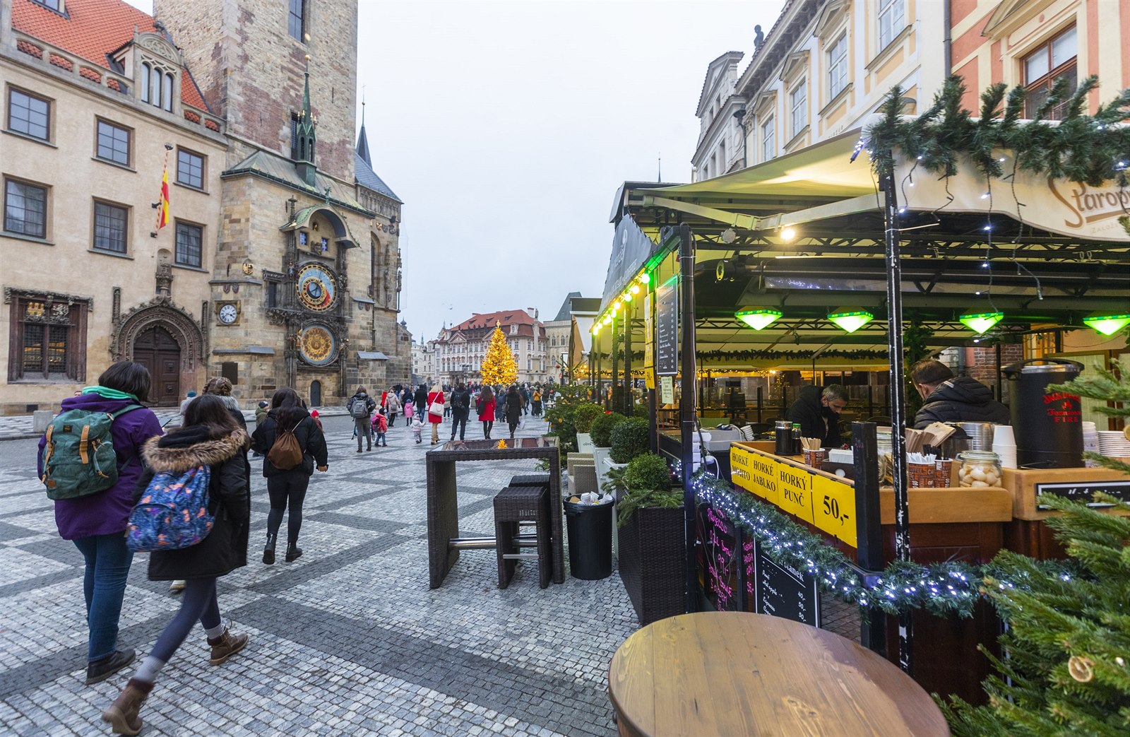 I přes opatření mařící cokoli, co by mohlo návštěvu Staromáku zpříjemnit, o lidi na náměstí úplná nouze není. Restauratéři se je snaží potěšit alespoň přes výdejní okénka. Někteří i svařákem.