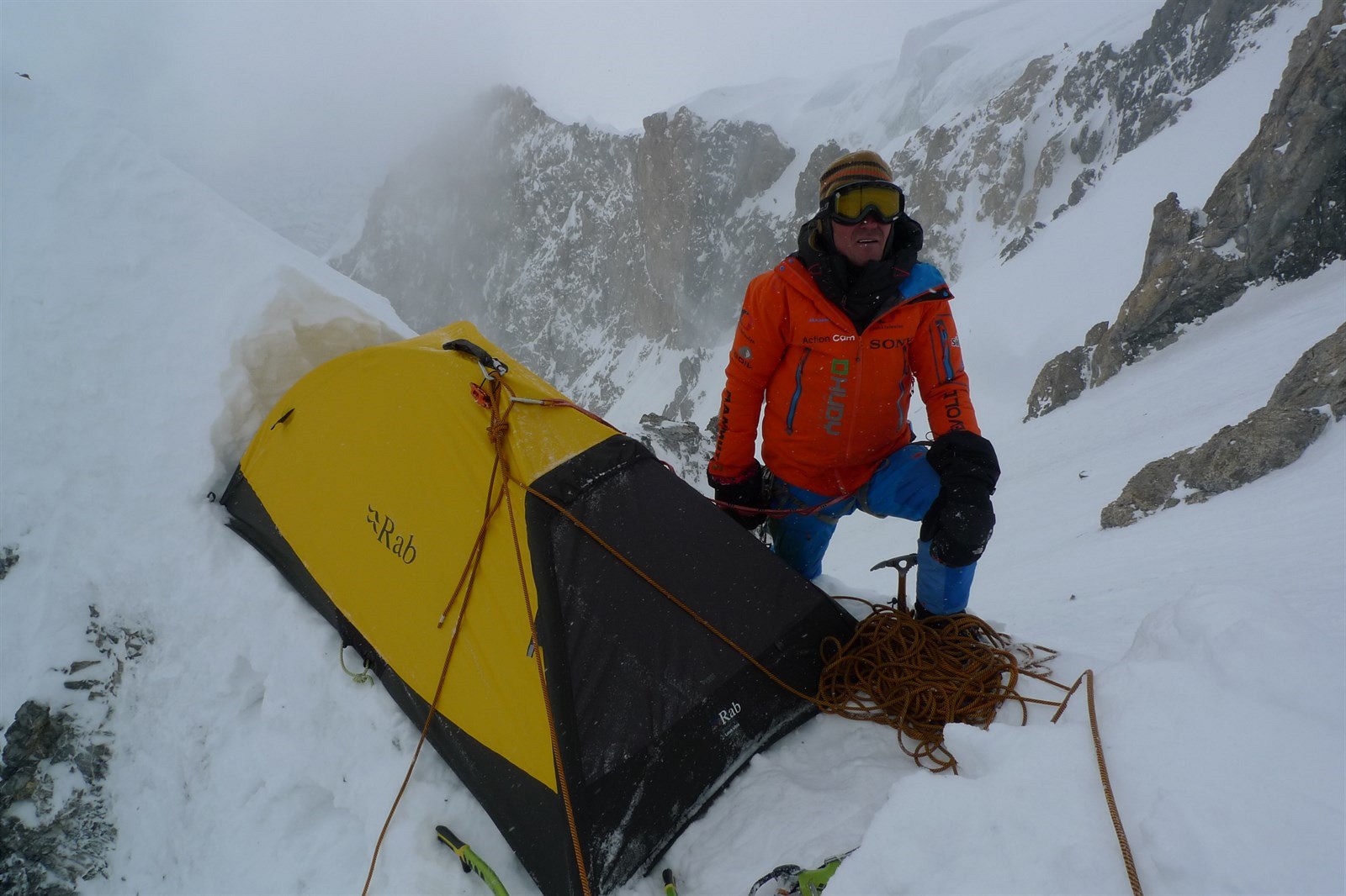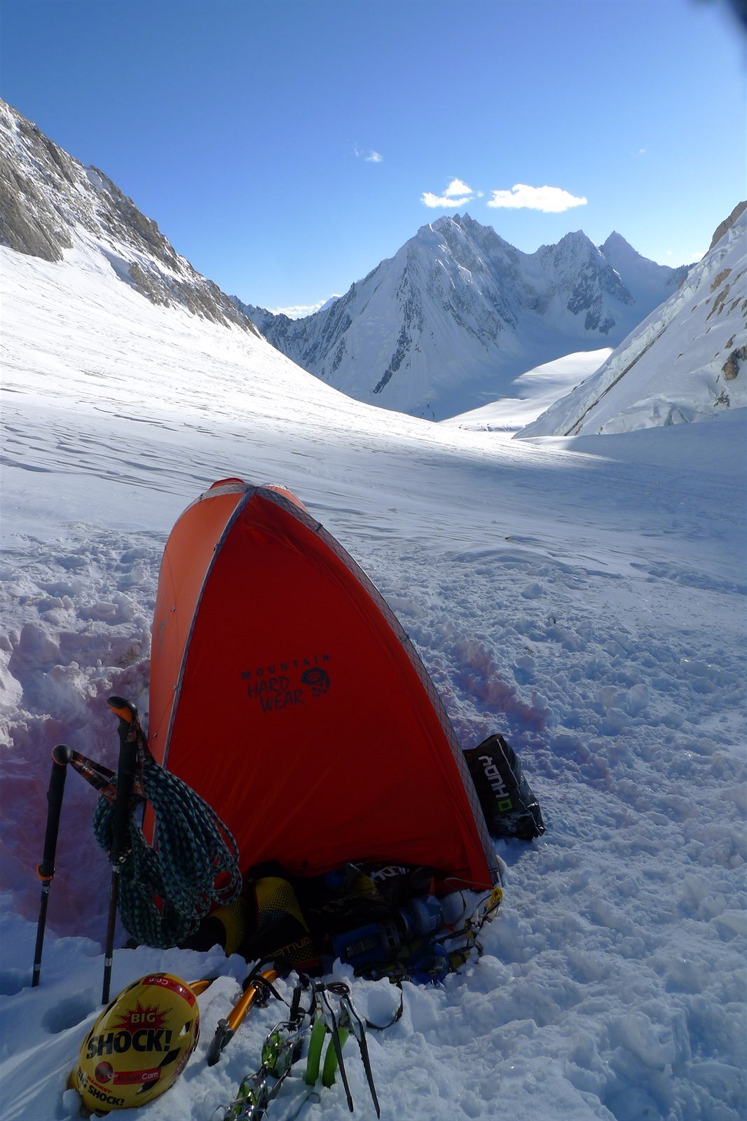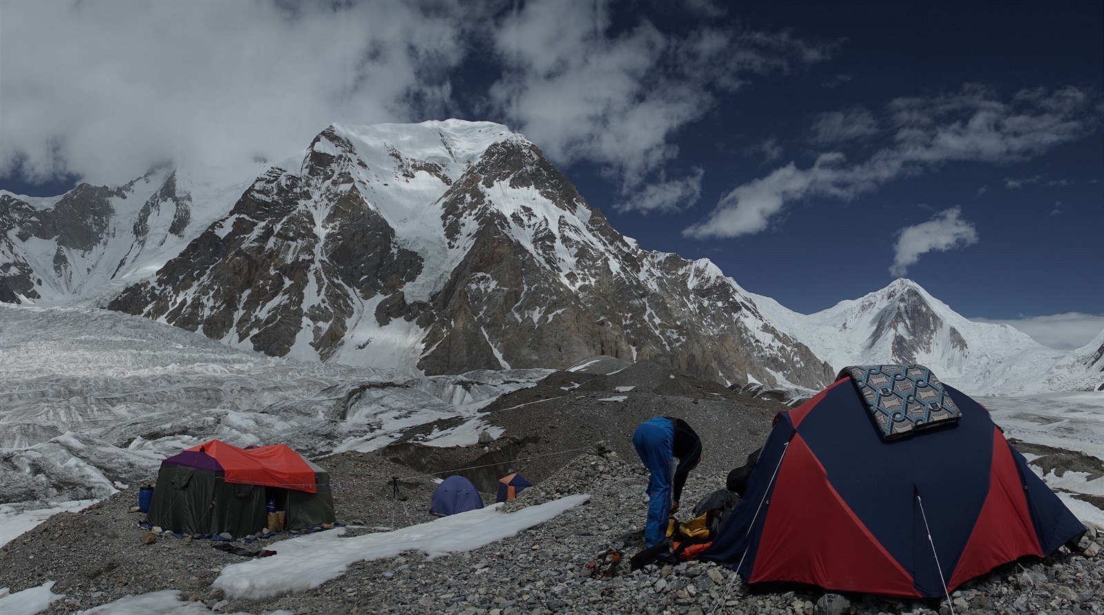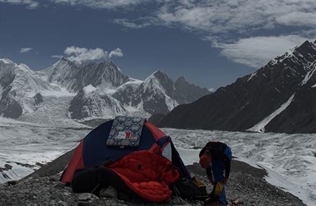 Stan horolezce Marka Holečka uprostřed hor v Gasherbrumu.