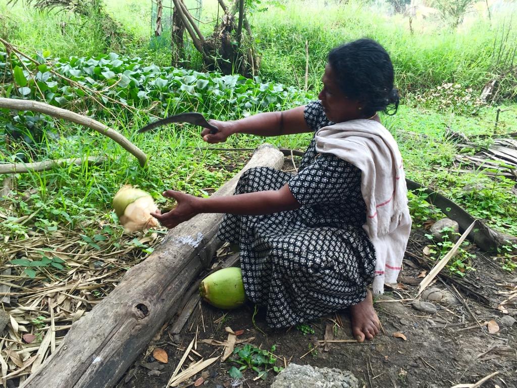 Indická farmářka družstva Manarcadu Social Service Society připravuje čerstvě utržený kokos.
