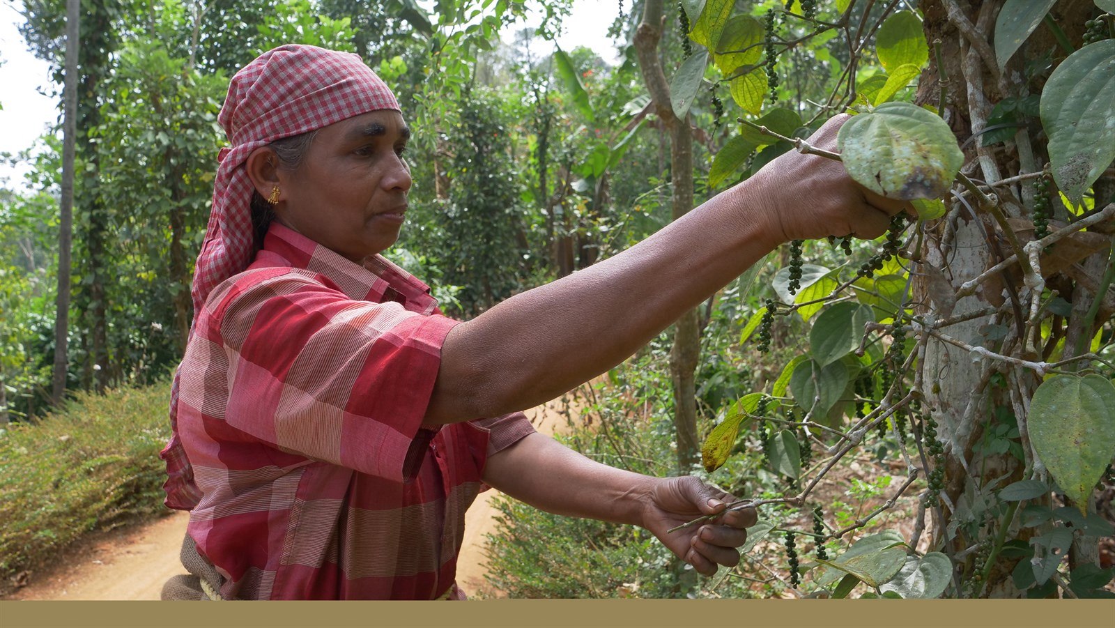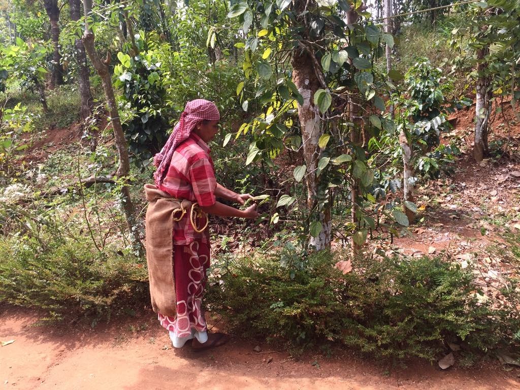 Indická farmářka Omana při sběru pepře.