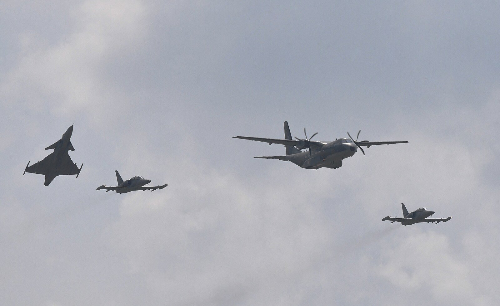 Den otevřených dveří čáslavské základny. Transportní stroj C295M CASA v doprovodu bitevníků L-159 a Gripenů