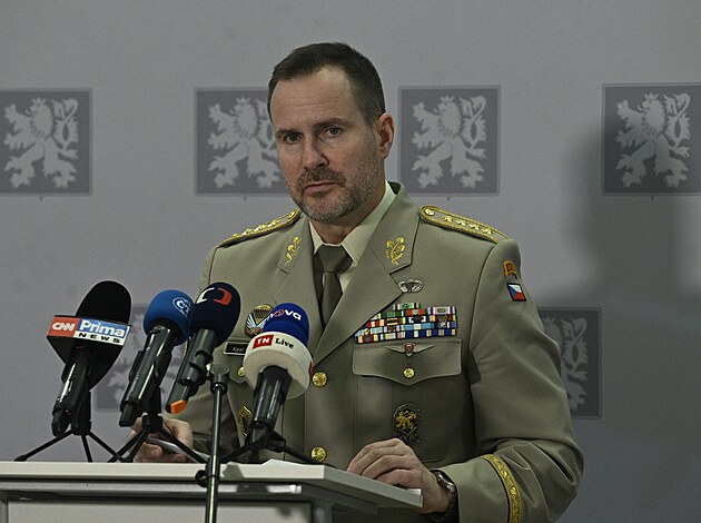 Náčelník generálního štábu Karel Řehka hovoří na briefingu po návratu ze summitu EU. (23. ledna 2026)