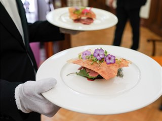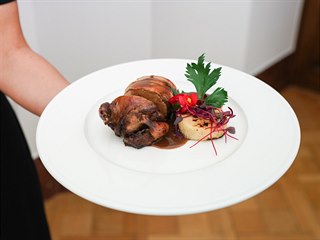 Jako předkrm měli šunku z černého prasete s ostružinami, bílou hořčicí a křenem. Hlavní chod byla křepelka bez kosti s bílými hříbky, husími játry a celerem v popelu. Oběd zakončili sladkou tečkou: meruňkovým sorbetem. Popíjet mohli například vlašský ryzlink, Cuvée Red či plzeňskou dvanáctku.