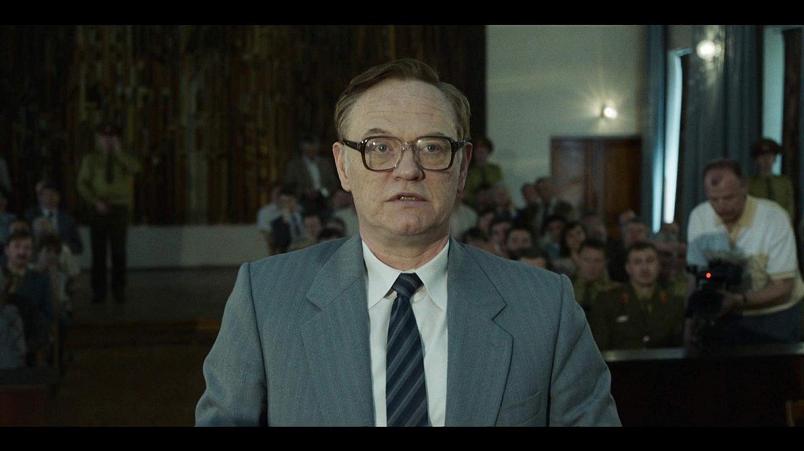 Valerij Legasov (Jared Harris) Soudní přelíčení s obžalovanými. Minisérie Černobyl (2019). Tvůrce: Craig Mazin.