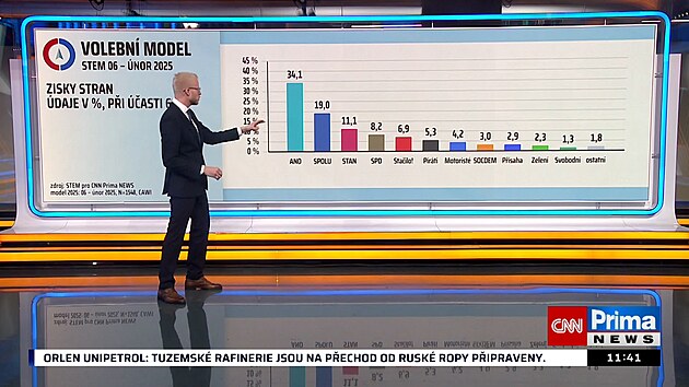 Podle volebního průzkumu STEM pro CNN Prima News by volby do Poslanecké sněmovny v únoru vyhrálo hnutí ANO se ziskem 34,1 procent hlasů. Druhá koalice SPOLU by dostala 19 procent, třetí by skončil STAN se ziskem 11,1 procent, což je oproti minule o téměř jeden procentní bod více. Do Sněmovny by se dostalo také SPD, koalice Stačilo! a Piráti.