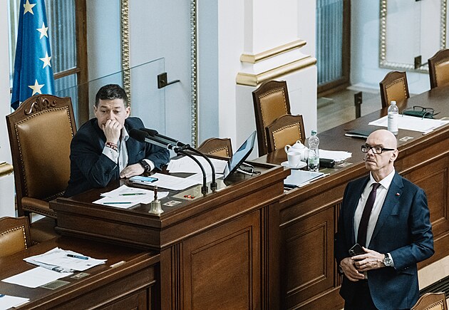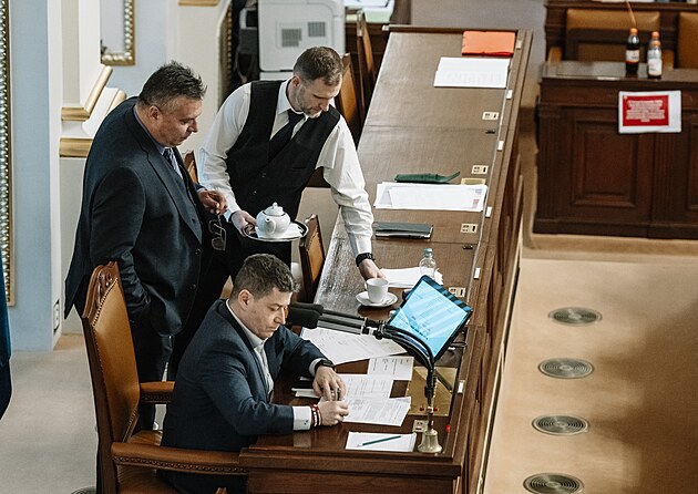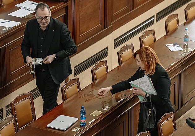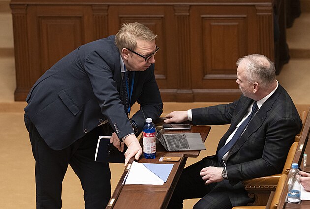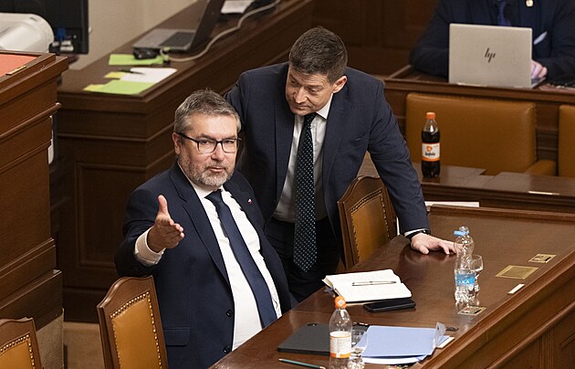 Pokračuje mimořádná schůze Sněmovny k hlasování o nedůvěře vládě premiéra Andreje Babiše. Na snímku Patrik Nacher (ANO) a ministr kultury Oto Klempíř (Motoristé). (4. února 2026)
