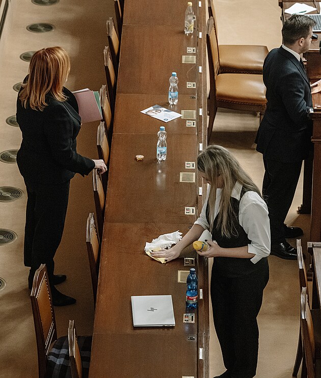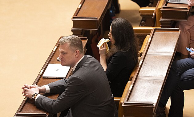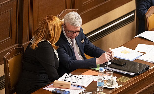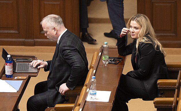 Mimořádná schůze Poslanecké sněmovny k vyslovení nedůvěry vládě. Na snímku Radim Králíček a Monika Oborná (ANO). (3. února 2026)