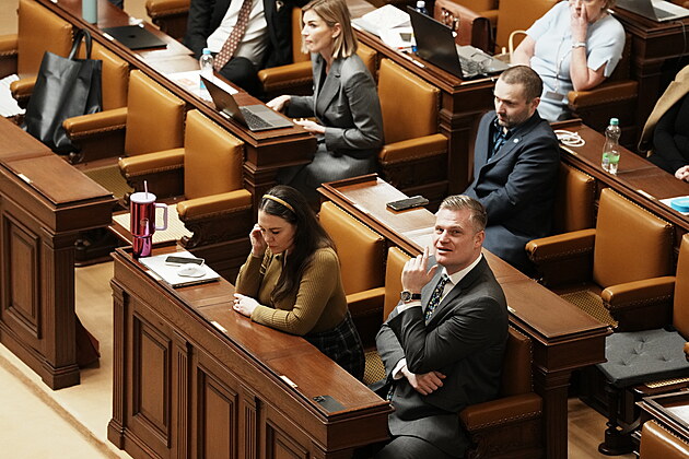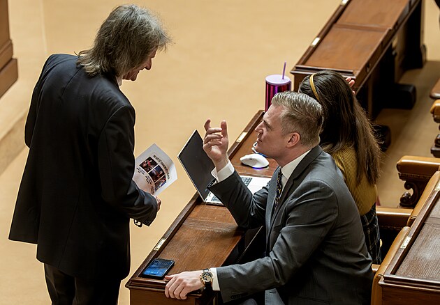 Pokračuje mimořádná schůze Sněmovny k hlasování o nedůvěře vládě premiéra Andreje Babiše. Na snímku Filip Turek (Motoristé) a Miroslav Ševčík (SPD). (4. února 2026)