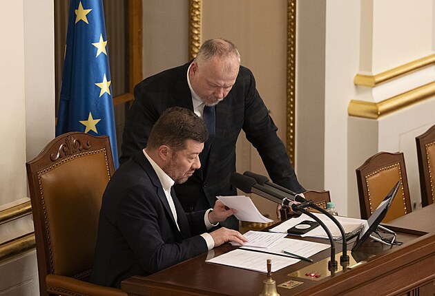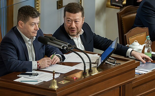 Pokračuje mimořádná schůze Sněmovny k hlasování o nedůvěře vládě premiéra Andreje Babiše. Na snímku Patrik Nacher (ANO) a Tomio Okamura (SPD). (4. února 2026)
