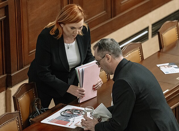 Mimořádná schůze Poslanecké sněmovny k vyslovení nedůvěry vládě. Na snímku Alena Schillerová a Karel Havlíček (ANO). (3. února 2026)