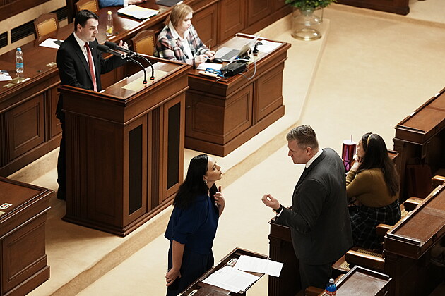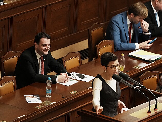 Druhým dnem pokračuje mimořádná schůze Sněmovny k hlasování o nedůvěře vládě premiéra Andreje Babiše. Na snímku Petr Macinka (Motoristé) u mikrofonu Olga Richterová (Piráti). (4. února 2026)