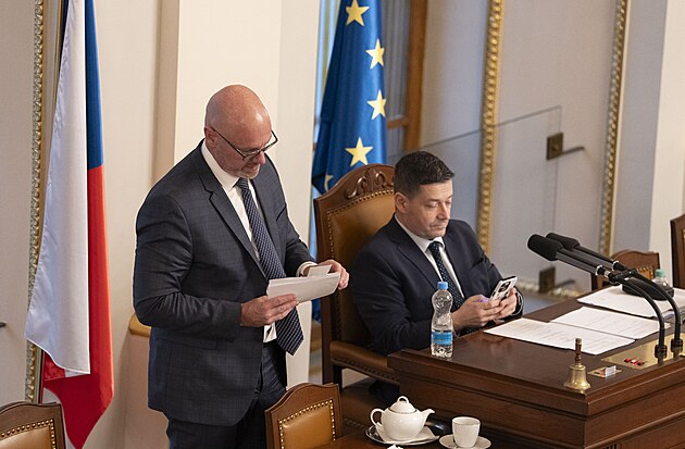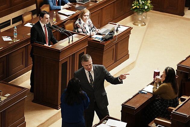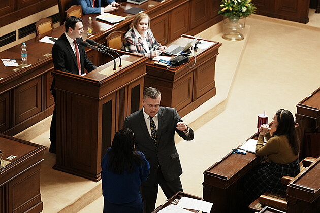 Druhým dnem pokračuje mimořádná schůze Sněmovny k hlasování o nedůvěře vládě premiéra Andreje Babiše. Na snímku Petr Macinka u mikrofonu a Filip Turek (oba Motoristé). (4. února 2026)