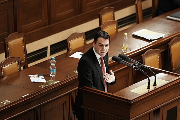 Druhým dnem pokračuje mimořádná schůze Sněmovny k hlasování o nedůvěře vládě premiéra Andreje Babiše. Na snímku Petr Macinka (Motoristé). (4. února 2026)
