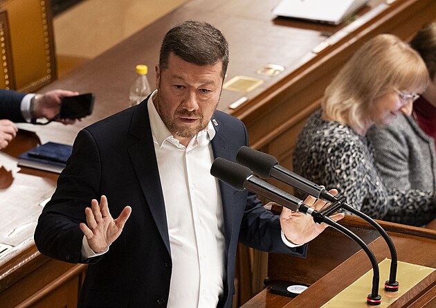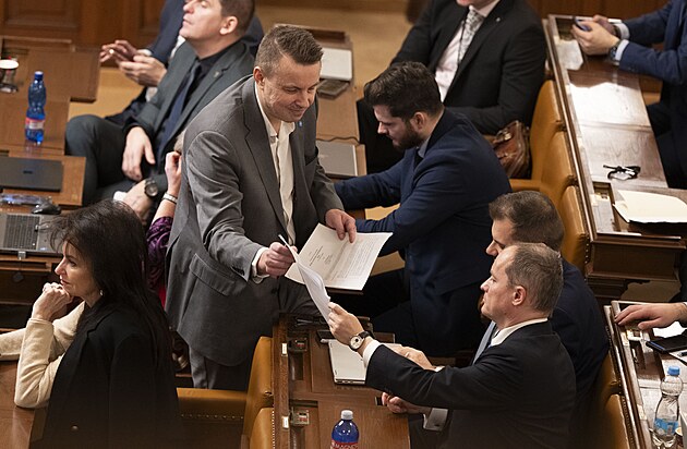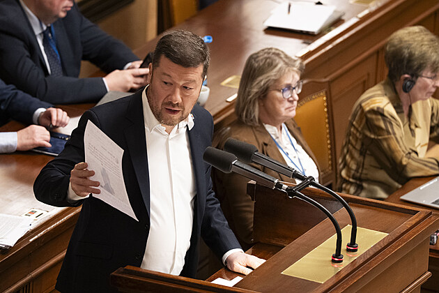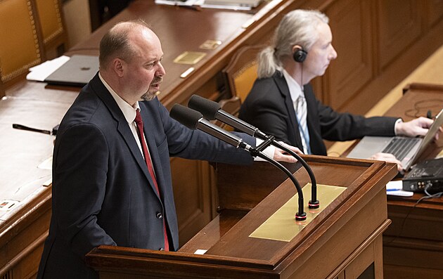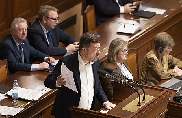 Druhým dnem pokračuje mimořádná schůze Sněmovny k hlasování o nedůvěře vládě premiéra Andreje Babiše. Na snímku Filip Turek (Motoristé). (4. února 2026)