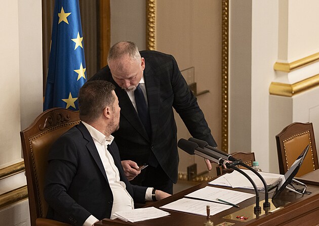 Mimořádná schůze Poslanecké sněmovny k vyslovení nedůvěry vládě. Na snímku vlevo ministr zemědělství Martin Šebestyán (SPD) a Patrik Nacher (ANO). (3. února 2026)