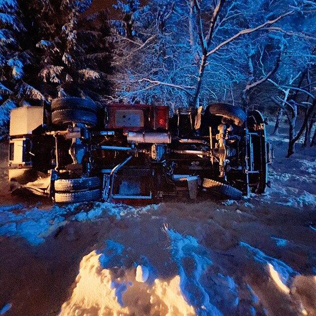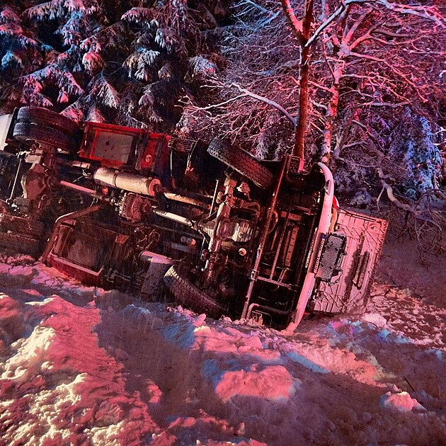 Cestou k nehodě na Děčínsku se lehce zranilo sedm hasičů. Jejich vozidlo se převrátilo na bok. (29. ledna 2026)