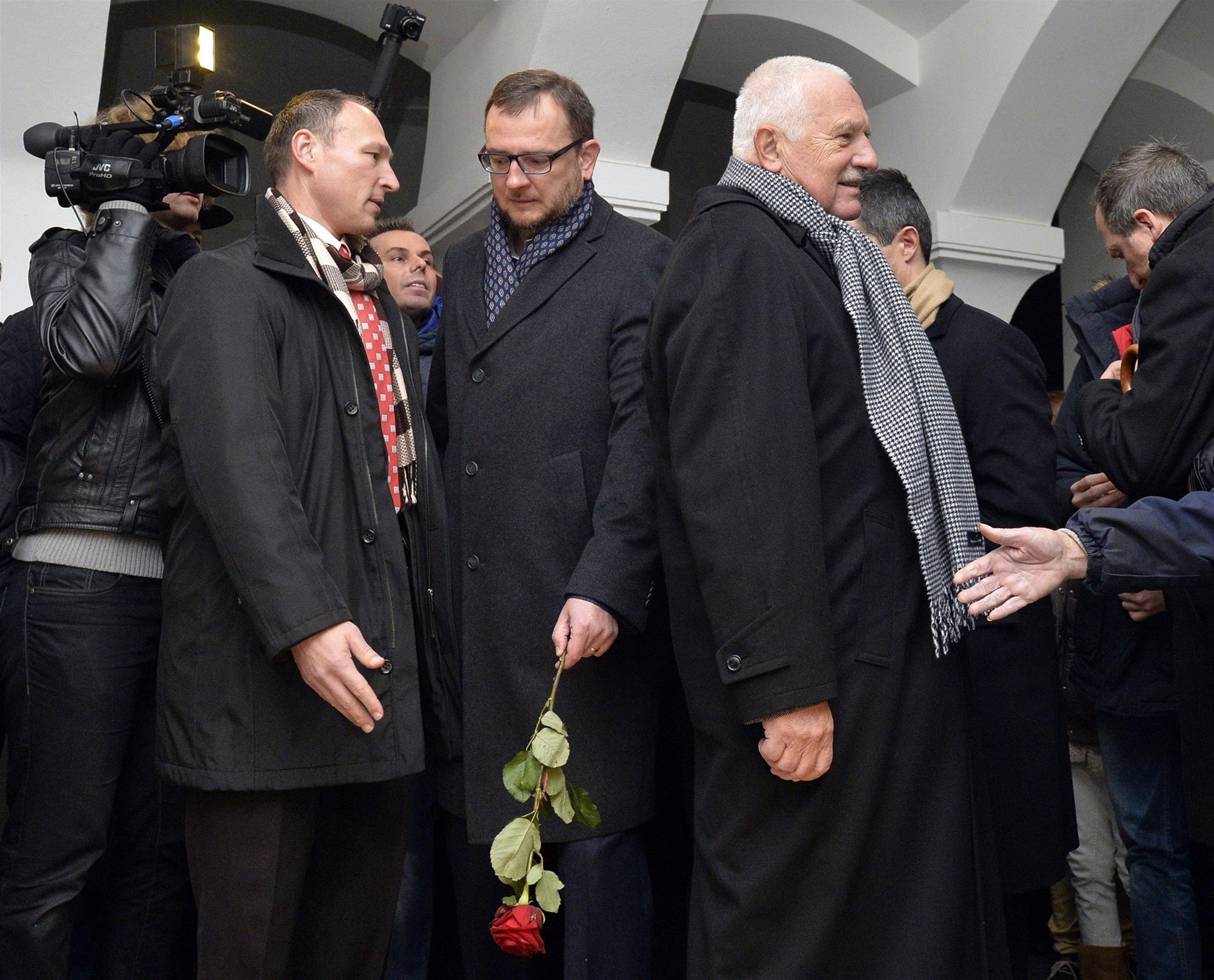 Bývalý prezident Václav Klaus položil 17. listopadu na pražské Národní třídě se svými příznivci kytici k pamětní desce připomínající události, které vedly k pádu komunistického režimu.