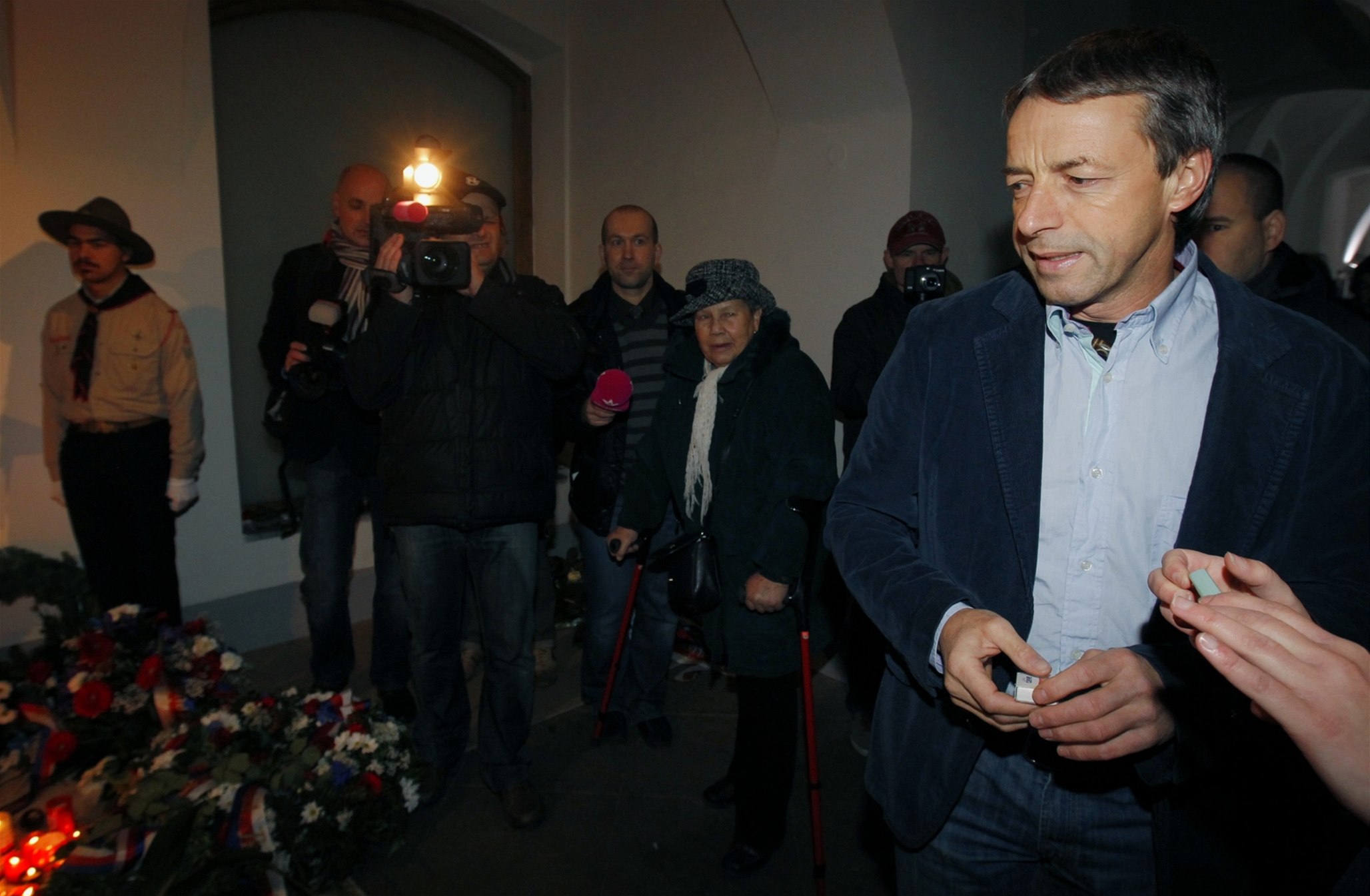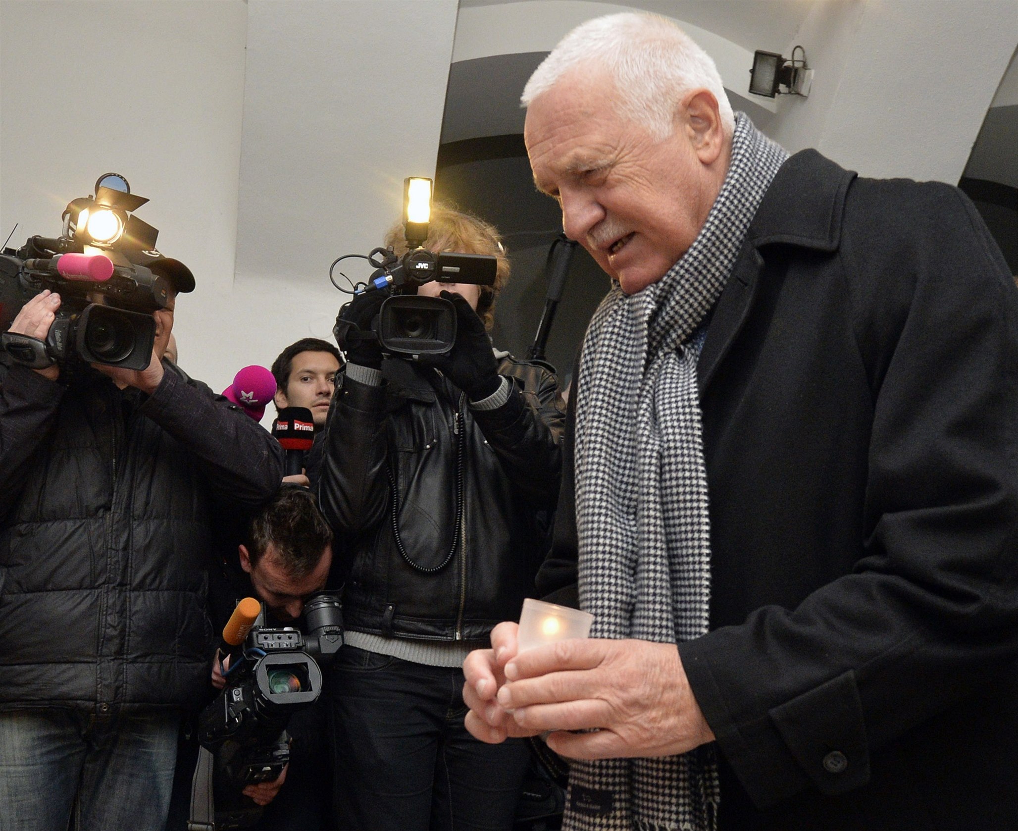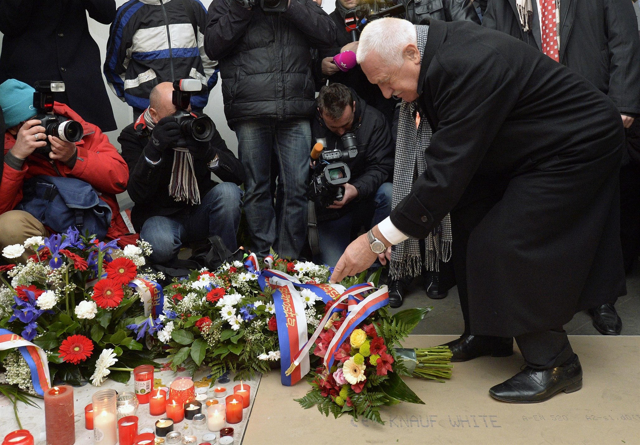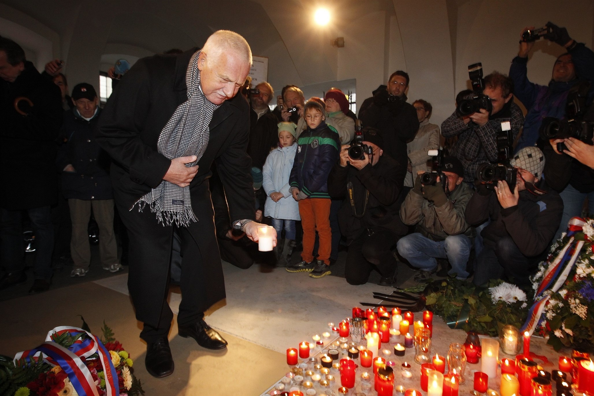 Václav Klaus klade svíci k pamětní desce na Národní třídě k příležitosti výročí 17. listopadu.
