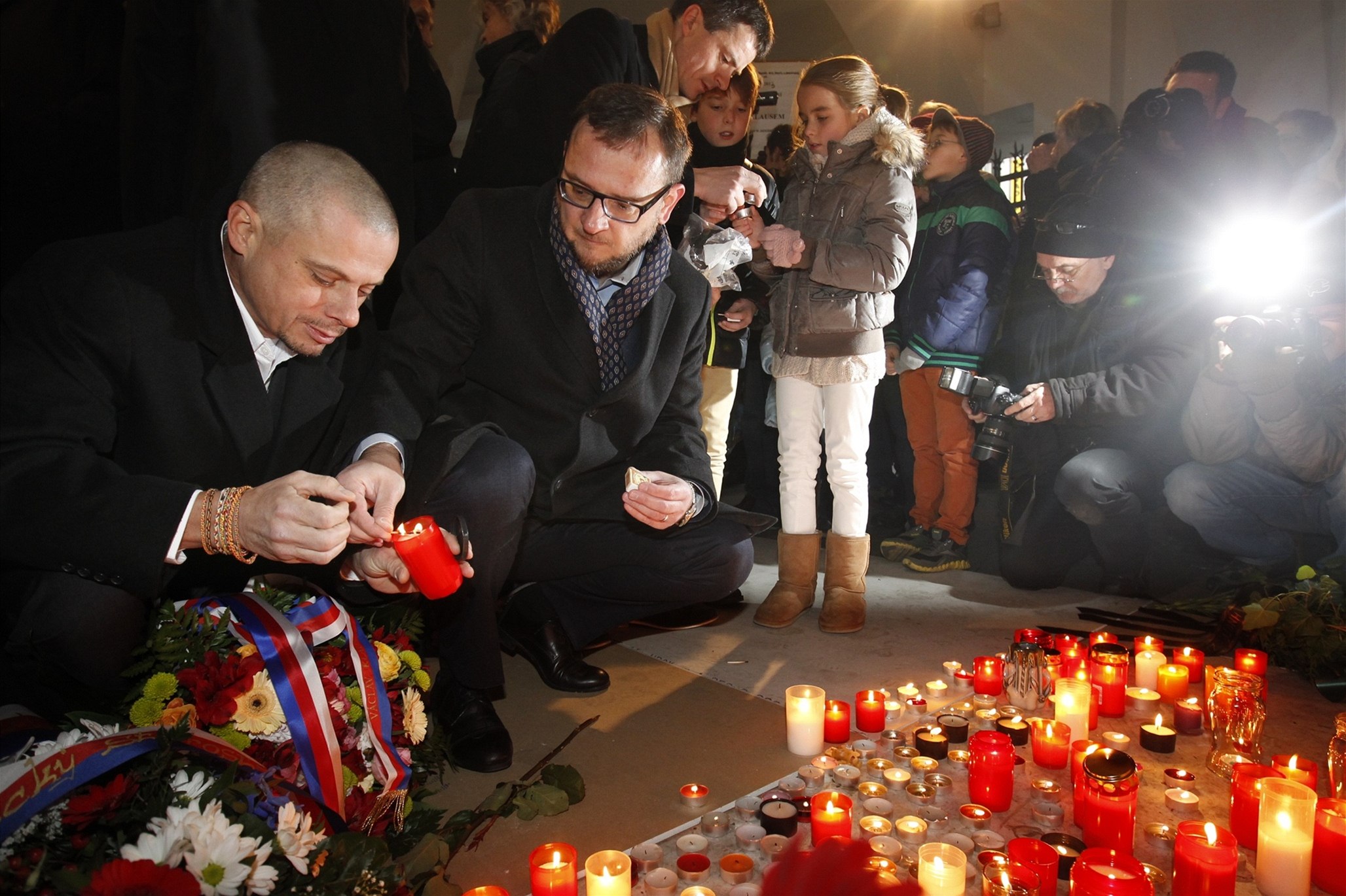 Petr Nečas zapaluje sJanem Vidímem svíci u pamětní desky na Národní třídě k příležitosti výročí 17. listopadu.