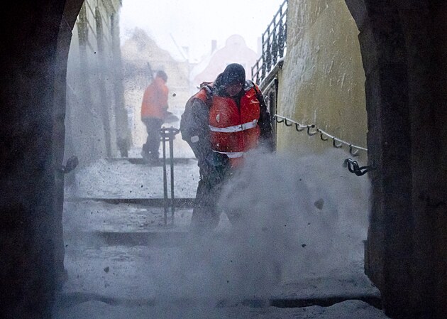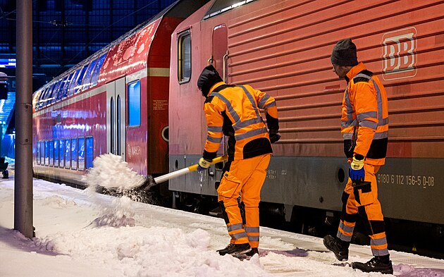Dělníci odklízejí sníh z nástupiště na hlavním nádraží po silném sněžení v Hamburku. (10. ledna 2026)