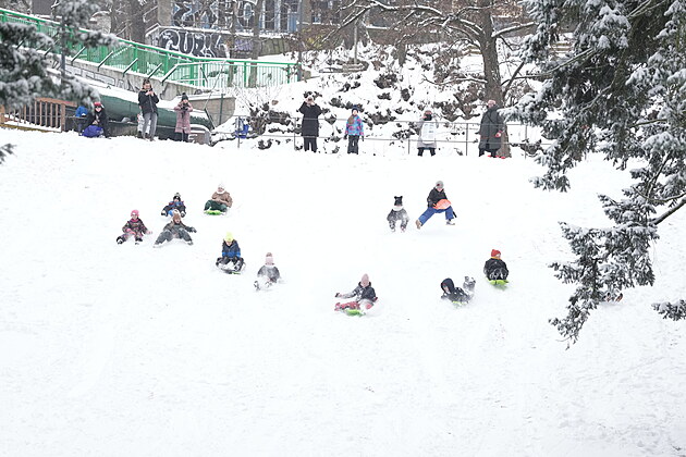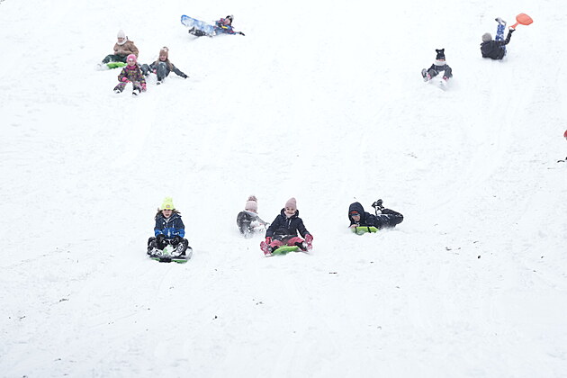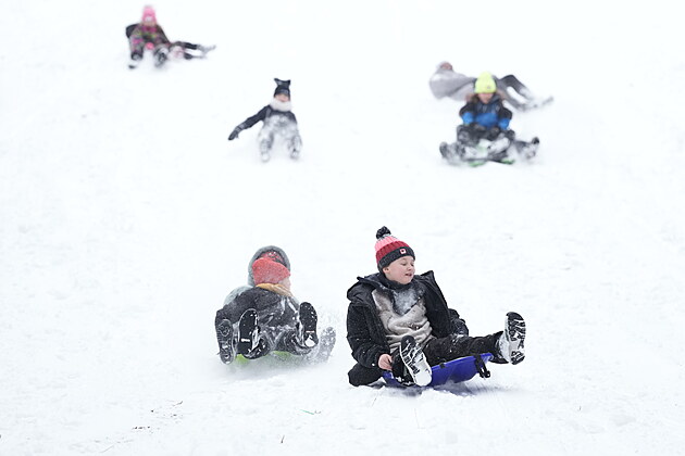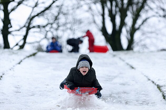 Děti sáňkují v Buxtonu ve Velké Británii. (9. ledna 2026)