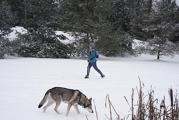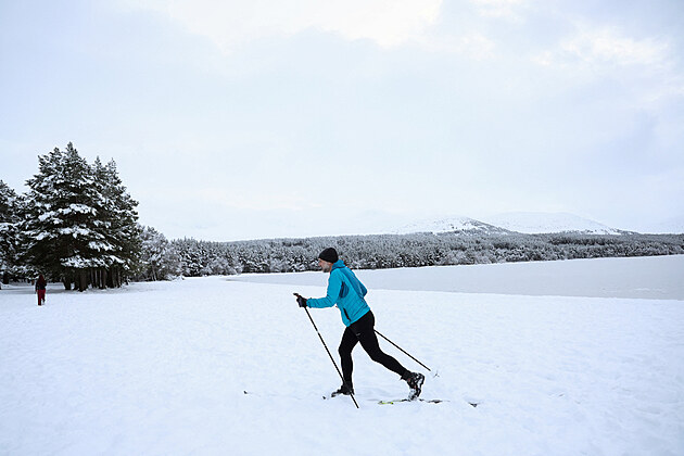 Muž běží na lyžích u jezera Loch Morlich ve Skotsku. (9. ledna 2026)