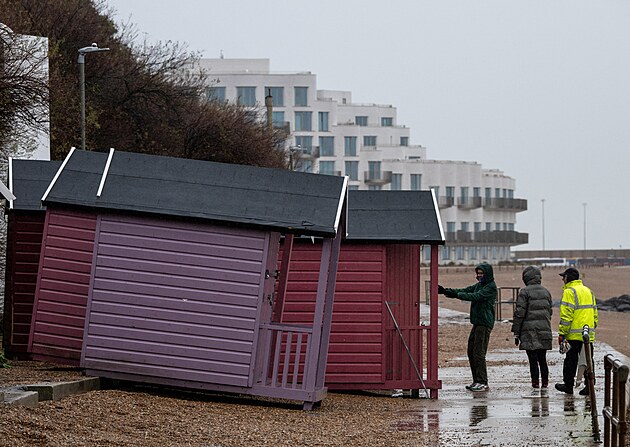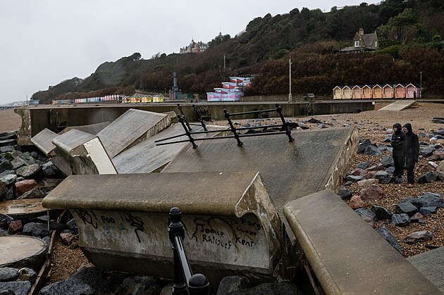 Námořní opevnění na pláži Mermaid Beach je vyvráceno a zničeno poté, co bouře Goretti zasáhla Spojené království. (9. ledna 2026)