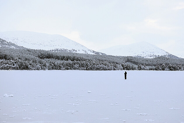 Muž kráčí po zamrzlém jezeře Loch Morlich ve Skotsku. (9. ledna 2026)