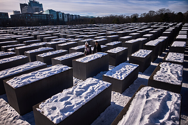 Návštěvníci procházejí zasněženým památníkem holocaustu za chladného zimního dne v Berlíně. (10. ledna 2026)