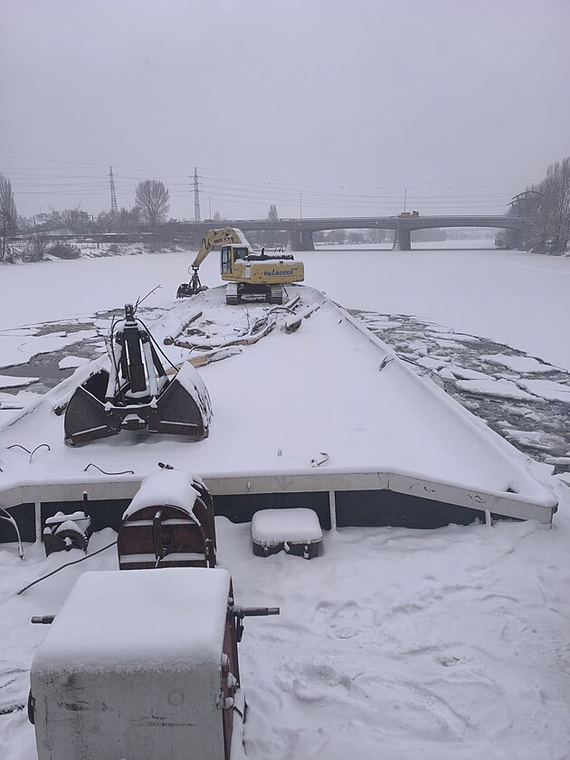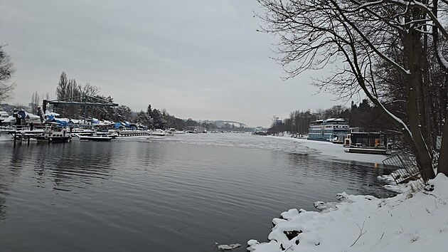 Vodohospodáři bourají led, na snímku je přístav Smíchov. (leden 2025)