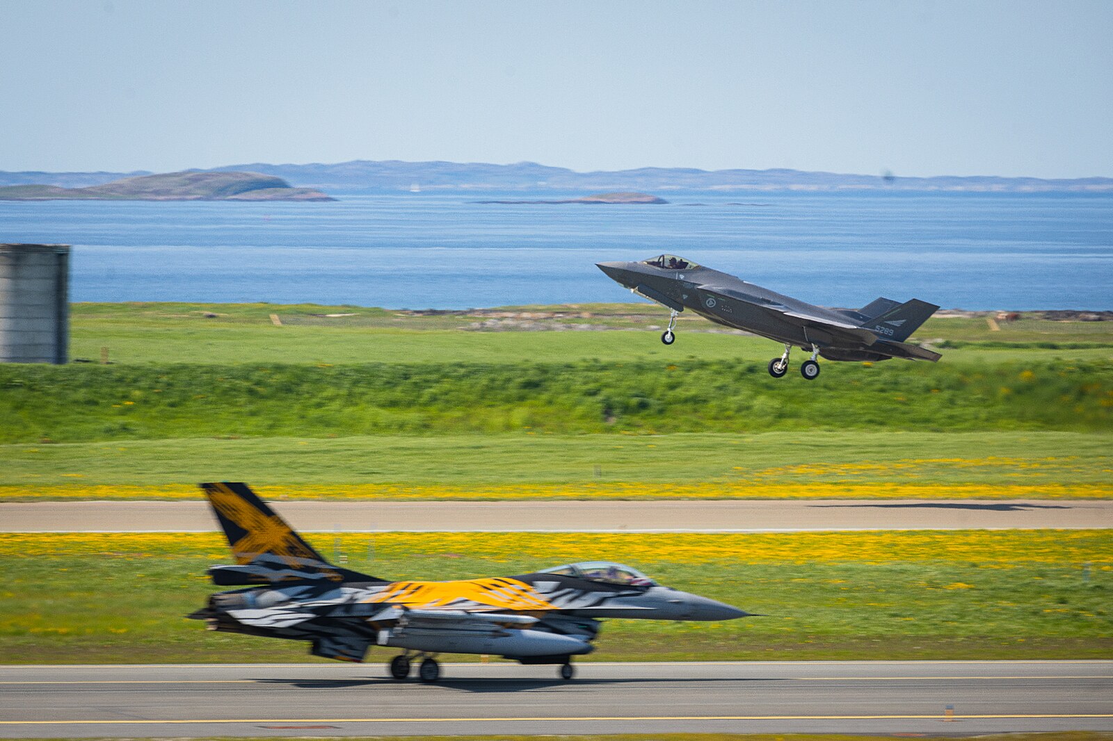 Letoun F-35 startuje ze základny Ørland v Norsku během cvičení Arctic Challenge 2023, v popředí stroj F-16 belgického letectva