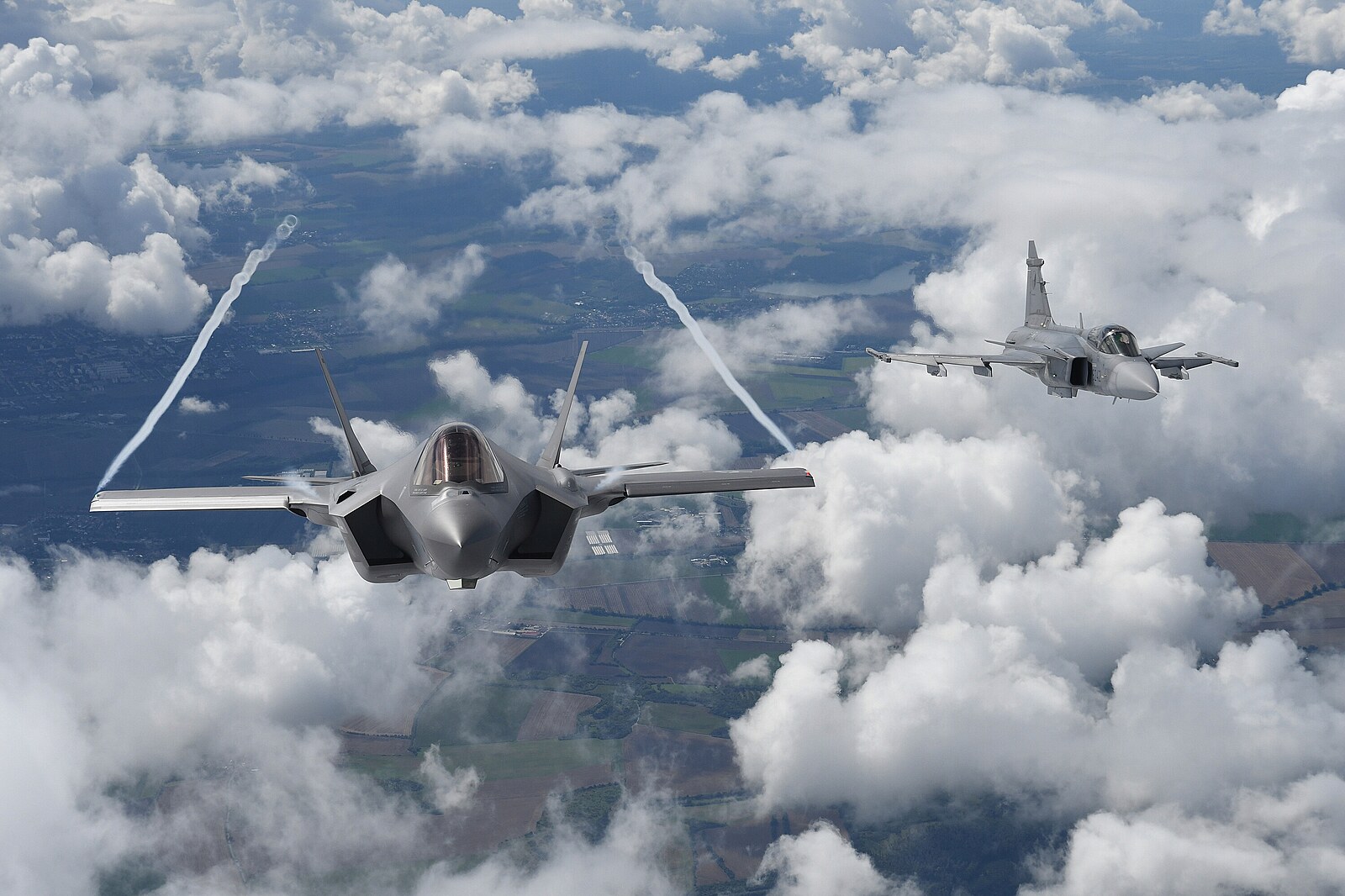 Letouny JAS-39 Gripen českých vzdušných sil a americký stroj F-35 během Dnů NATO v Ostravě