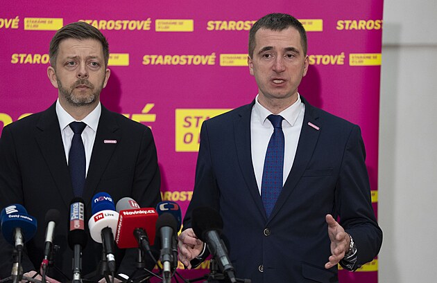 Tisková konference poslaneckého klubu STAN ve Sněmovně před vyhlášením nedůvěry vládě Andreje Babiše opozicí. Na snímku Vít Rakušan a Lukáš Vlček. (3. února 2026)
