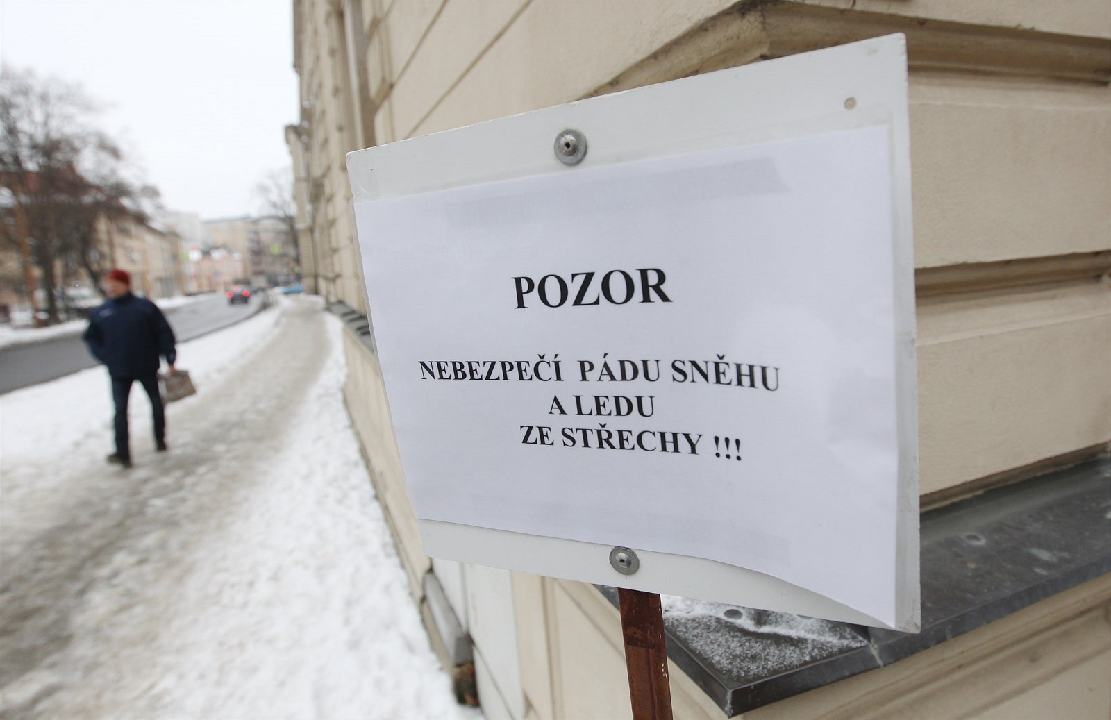 Chodník před krajským úřadem v Jihlavě úplně zametený není. Cedule navíc varují před pádem sněhu a ledu ze střechy.